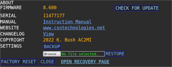 | ABOUT | Open About window. Update Firmware and factory reset. |
