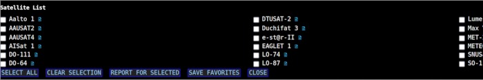 To choose your favorites, click the VIEW ALL button. You will be presented with a list of all the satellites contained in the currently loaded TLE.