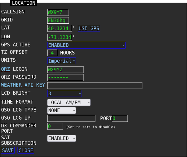 | LOCATION | Open Location, Grid square, Callsign, Time settings. |
