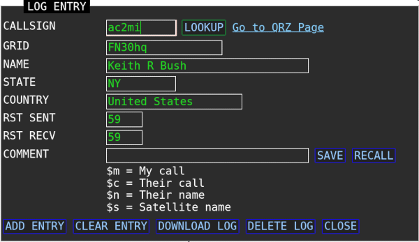 Format: SAT,TRANSPONDER,SATNAME,CALL,GRID,MODE,COMMENT,RSTSENT,RSTRECV,UPFREQ,DOWNFREQ,NAME