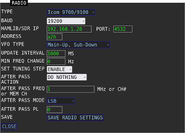 To enable SDR control in the S.A.T., simply open the Radio Settings panel and enter the IP address of the computer running the SDR program.