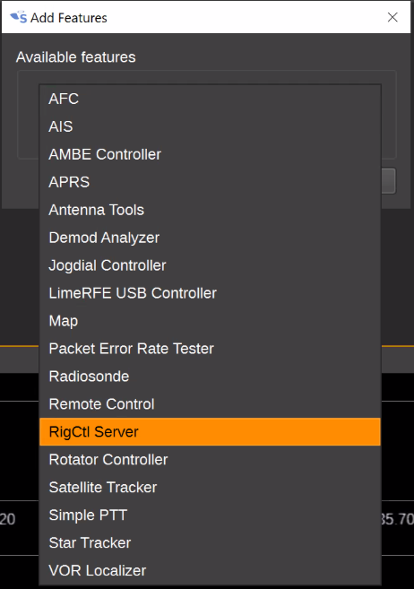 to open the Add Feature dialog. Select RigCtl Server and click the Apply button. Click Close to close the Add Feature dialog.